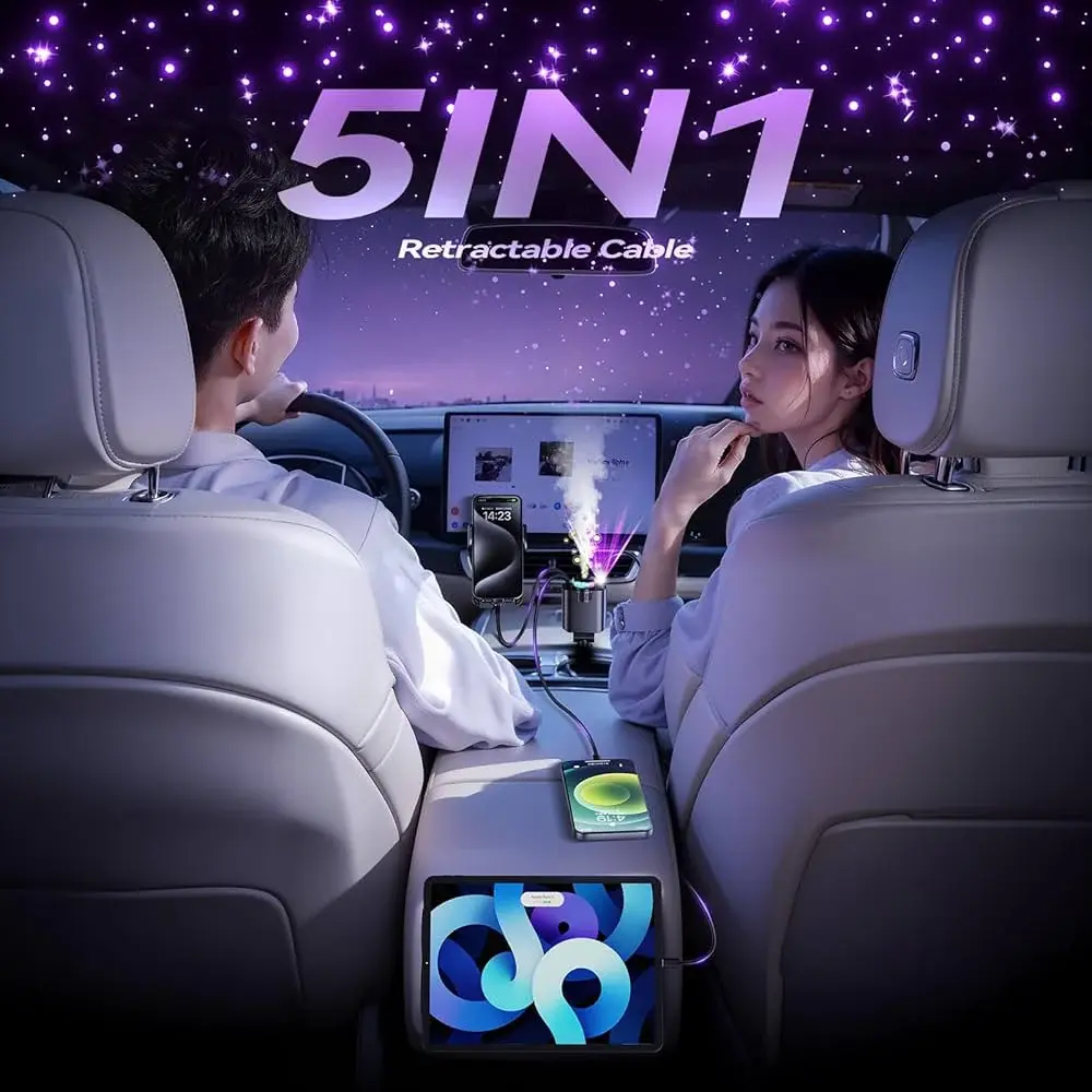 5 وظائف في جهاز واحد شحن سريع لأكثر من جهاز في نفس الوقت كابلين مدمجين قابلين للسحب (Type-C + iOS) إضاءة LED Starlight لجو عصري داخل السيارة معطر هواء مدمج برائحة لطيفة تصميم أنيق ومتين حماية ذكية من ارتفاع الحرارة أو التيار